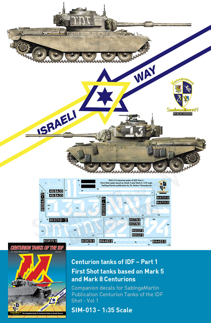First Shot tanks based on Mark 5 and Mark 8 Centurions. Companion decals for SabIngaMartin Pablication "Centurion Tanks of the IDF, Shot volume 1."